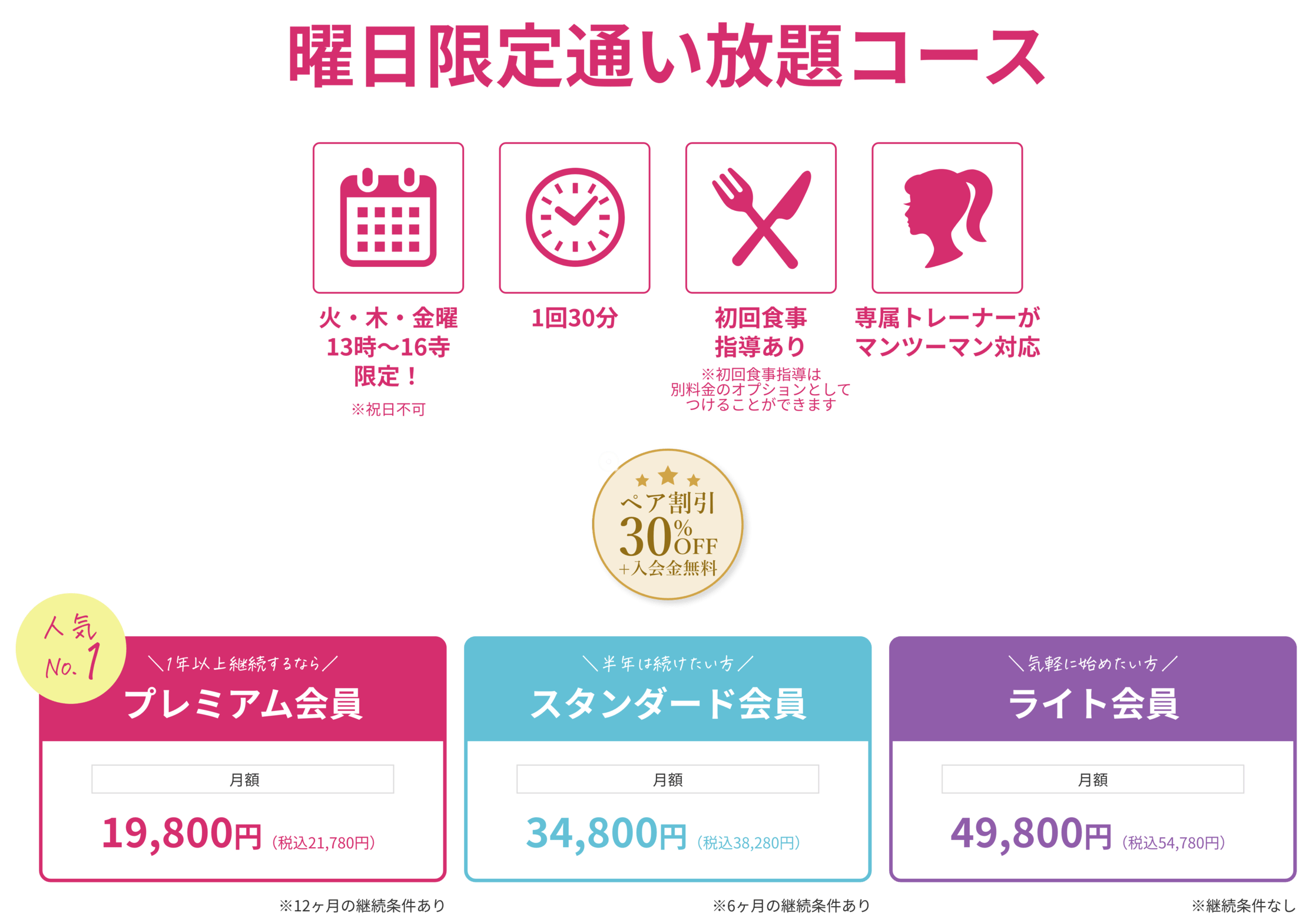 お客様の達成したい目標・改善したいお悩み・通える頻度・ご予算などカウンセリングでしっかりとお伺いして、お客様と一緒にコースを選んでいきます。運動習慣をつけてマイペースに通いたい方は月4回、しっかり身体を変えたい方は月8回、ボディメイクで人生を変えたい本気レベルの方は月12回をおすすめしています。 私たちはボディメイクを通して「お客様の人生を豊かに幸せに」というミッションのもとに活動しております。「短期的に体が変わっただけで、すぐにリバウンドしてしまった」というのはあまり意味がないと思っておりますので、短期集中よりも回数は少なくても習慣的に長く通っていただく方が、リバウンドする確率も低く、本質的なサポートが可能です。お客様に合わせてプランご提案することが可能ですので、お困りの場合はカウンセリングにて担当のトレーナーに、目標設定からご相談ください。