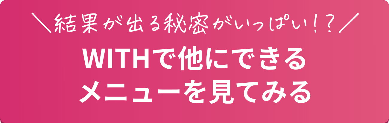 女性らしい綺麗なボディライン、美脚づくりやヒップアップはWITHの得意分野ですのでお任せください!トレーナーは全員が女性、お客様も女性の方だけなので、女性の身体づくりの知識・技術には自信があり、女性らしい身体をつくるためのボディメイクに特化しております。 ヒップアップや美脚のつくり方、姿勢の改善など、綺麗な女性らしいボディラインをつくるためのノウハウを知り尽くしております。特に改善したいボディデザインのご要望がございましたら、お気軽に担当パーソナルトレーナーまでご相談ください!